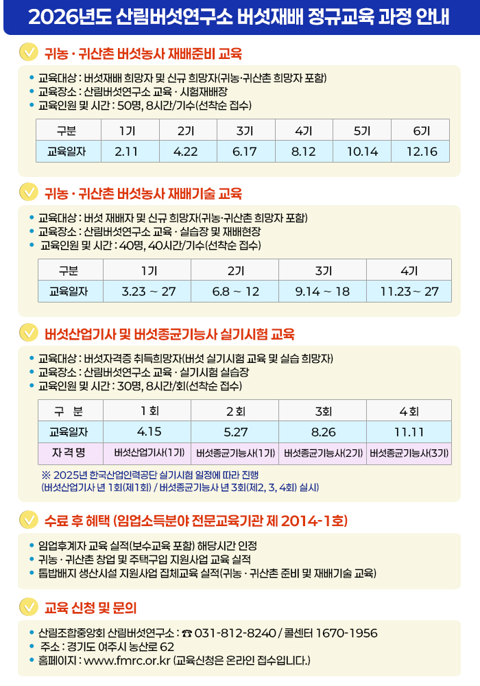 < 2026년 귀농·귀산촌 버섯농사 "재배기술" 교육생 모집 안내 > ◈ 교육일정 : 2026년 3..